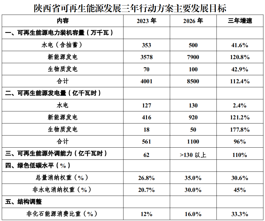 日前,陜西省發(fā)改委印發(fā)《關(guān)于印發(fā)陜西省可再生能源發(fā)展三年行動方案(2024—2026)的通知》,初步規(guī)劃預計到2026年省內(nèi)新能源裝機規(guī)模達79GW,增速120.8%。 文件規(guī)劃,到2026年,全省可再生能源裝機突破8500萬千瓦,非化石能源裝機占比達到55%以上;2030年,力爭可再生能源裝機規(guī)模達到1.2億千瓦左右,省內(nèi)自用非化石能源裝機占比達到60%左右。 根據(jù)其主要發(fā)展目標來看,2026年陜西省新能源裝機擬達到79GW以上,而日前陜西省能源局新能源處的公開信息顯示,預計2024年底陜西省新能源裝機將達50GW以上,這意味著未來2年陜西省新能源新增空間最低目標為29GW,年均增幅近15GW/年。 文件要求,大力推進風電光伏發(fā)電規(guī)?;l(fā)展。結(jié)合光伏用地政策,依托毛烏素沙地和陜北黃土高原地形,建設(shè)千萬千瓦級光伏發(fā)電基地。其中:光伏治沙方案資源量達30GW以上;關(guān)中旱腰帶建設(shè)渭北千萬千瓦級農(nóng)光互補可再生能源基地;陜南地區(qū)因地制宜發(fā)展林光、茶光互補。 每年競爭10GW可再生能源建設(shè)規(guī)模,到2026年建成榆林20GW級;延安、渭南10GW級,全省20個GW級可再生能源發(fā)展示范縣。 此外,加快推動分布式新能源就近開發(fā),推動屋頂分布式光伏規(guī)?;_發(fā),力爭新建公共機構(gòu)建筑、新建廠房屋頂光伏覆蓋率達到50%以上。到2026年,全省分布式可再生能源裝機達15GW以上。 特高壓方面,除已有通道外,研究論證新建青海經(jīng)甘肅至陜南雙回750千伏線路,進一步提高我省與青海等省互濟能力。加快陜皖、陜豫外送通道規(guī)劃新能源項目建設(shè),實現(xiàn)更大范圍和規(guī)模的資源優(yōu)化配置。 在政策保障方面,進一步研究用地用林用草政策,明確細化相關(guān)標準,加強要素保障,在土地林業(yè)資源保障、調(diào)度管理等方面優(yōu)先配置,持續(xù)提升全省分布式項目電網(wǎng)接入水平。 技術(shù)方面則推進隆基高效BC電池產(chǎn)業(yè)化及量產(chǎn),加大對鈣鈦礦電池等關(guān)鍵技術(shù)的支持力度,爭取早日產(chǎn)業(yè)化。