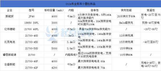 2024年至今,億緯鋰能、新能安、比克電池、睿恩新能源各家企業(yè)18/21系全極耳小圓柱新品集中發(fā)布。