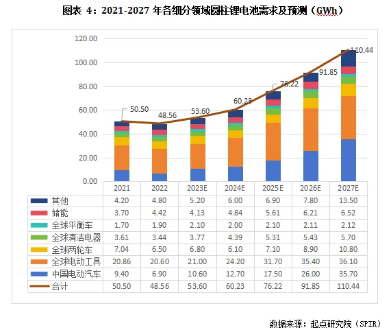 據(jù)起點研究院(SPIR)測算,到2025年中國新能源汽車領(lǐng)域?qū)A柱電池的需求量將達到17.5GWh、全球電動工具對圓柱鋰電池的需求將達到31.7GWh、全球家儲及便攜式儲能需求5.61GWh、全球兩輪車對圓柱鋰電池的需求將達到7.1GWh、全球清潔電器需求5.31GWh、全球平衡車領(lǐng)域需求2.1GWh。