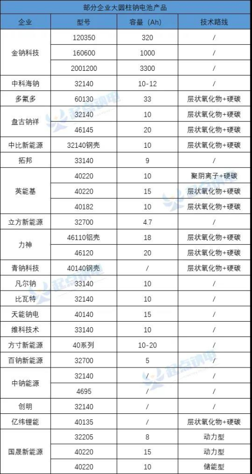 鈉電大圓柱電池方向上,自2023年至今,圓柱鈉離子電池深受行業(yè)追捧,據(jù)不完全統(tǒng)計,目前市場上有金鈉科技、多氟多、盤古新能源、中比新能源、拓邦、英能基、立方新能源、力神、中科海鈉、創(chuàng)明電池、猛獅科技、上海百鈉、青鈉科技、中鈉能源、凡爾鈉、億緯鋰能、江林時代、元順柒星、國晟新能源、江蘇智泰等眾多鈉電池相關(guān)企業(yè)已經(jīng)先后發(fā)布了圓柱型鈉離子電池產(chǎn)品。