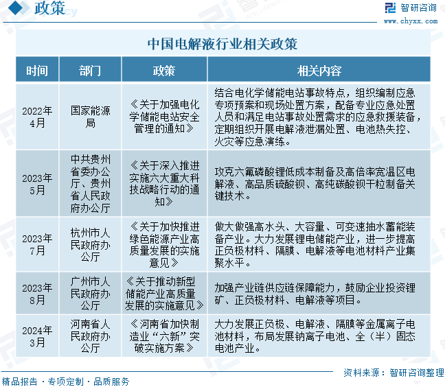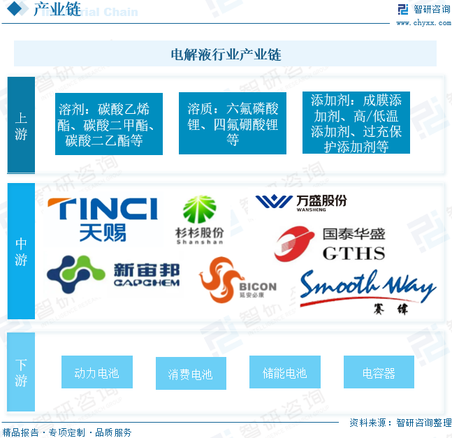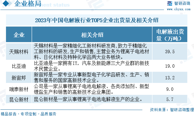 電解液是化學(xué)電池、電解電容等使用的介質(zhì),用于不同行業(yè)其代表的內(nèi)容相差較大。有生物體內(nèi)的電解液(也稱電解質(zhì)),也有應(yīng)用于電池行業(yè)的電解液,以及電解電容器、超級電容器等行業(yè)的電解液。不同的行業(yè)應(yīng)用的電解液,其成分相差巨大,甚至完全不相同。具體的電解液成分和配方可能因不同的鋰電池類型,如鋰離子電池、鋰聚合物電池等以及應(yīng)用需求而有所差異。此外,電解液的配方也在不斷發(fā)展和改進(jìn),以提高電池性能、安全性和環(huán)境友好性。 電解液行業(yè)政策 近年來,中國加快出臺電解液行業(yè)相關(guān)政策,以推動電解液行業(yè)的健康發(fā)展。2022年4月,國家能源局印發(fā)《關(guān)于加強電化學(xué)儲能電站安全管理的通知》,提出要結(jié)合電化學(xué)儲能電站事故特點,組織編制應(yīng)急專項預(yù)案和現(xiàn)場處置方案,配備專業(yè)應(yīng)急處置人員和滿足電站事故處置需求的應(yīng)急救援裝備,定期組織開展電解液泄漏處置、電池?zé)崾Э?、火?zāi)等應(yīng)急演練。2024年3月,河南省人民政府辦公廳印發(fā)《河南省加快制造業(yè)“六新”突破實施方案》,提出要大力發(fā)展正負(fù)極、電解液、隔膜等金屬離子電池材料,布局發(fā)展鈉離子電池、全(半)固態(tài)電池產(chǎn)業(yè)。 電解液行業(yè)產(chǎn)業(yè)鏈 電解液產(chǎn)業(yè)鏈上游主要包括溶劑、溶質(zhì)、添加劑,其中溶劑包括碳酸乙烯酯、碳酸二甲酯等;溶質(zhì)主要指六氟磷酸鋰;電解液添加劑主要包括成膜添加劑、過充保護(hù)添加劑、高/低溫添加劑等。中游為電解液的分類,主要有液體電解液、固體電解液、熔鹽電解液等;電解液下游主要應(yīng)用于動力電池、消費電池、儲能電池、電容器。 全球電解液行業(yè)發(fā)展現(xiàn)狀 電解液是鋰離子電池的四大主要組成部分之一,是實現(xiàn)鋰離子在正負(fù)極遷移的媒介,對鋰電容量、工作溫度、循環(huán)效率以及安全性都有重要影響。2022年全球電解液市場規(guī)模達(dá)到824.20億元,同比增長92.39%。統(tǒng)計數(shù)據(jù)顯示,2023年全球電解液市場規(guī)模為522.1億元,同比下滑36.7%,主要原因在于電解液價格的下滑。 通常電解液占電池重量和體積的比重分別為15%、32%,其對純度及雜質(zhì)的含量要求非常高,生產(chǎn)過程中需要高純的原料以及必要的提純工藝。2017年至2022年全球電解液出貨量由16.7萬噸增長至104.3萬噸,2023年全球電解液出貨量約為131.26萬噸。 中國電解液行業(yè)發(fā)展現(xiàn)狀 近年來,隨著全球及國內(nèi)新能源汽車和鋰電池行業(yè)快速發(fā)展,國內(nèi)在電解液材料方面已具備一定的產(chǎn)能和技術(shù)優(yōu)勢,也使得我國電解液市場規(guī)模不斷增長;尤其是2021年得到迅速發(fā)展。數(shù)據(jù)顯示,2021年,我國電解液市場規(guī)模迅速增長,約為346.53億元,同比上升355%。2023年我國電解液市場規(guī)模約為700億元。 我國電解液產(chǎn)量不斷增加,近年來隨著鋰電池產(chǎn)業(yè)的成熟,國產(chǎn)鋰電池電解液從2002年左右開始進(jìn)入市場,并逐步取代進(jìn)口產(chǎn)品。2022年中國電解液出貨量為89.1萬噸,同比增長75.70%。2023年中國電解液出貨量為113.8萬噸,同比增長27.7%,中國電解液出貨量的全球占比繼續(xù)提升至86.7%。 電解液行業(yè)企業(yè)格局和重點企業(yè)分析 1、企業(yè)格局 中國作為全球最大的電動汽車市場,電解液市場規(guī)模也在不斷擴大。中國電解液市場同樣競爭激烈,國內(nèi)品牌與國際品牌均在爭奪市場份額,頭部化集中較為明顯。2023年中國電解液行業(yè)TOP5企業(yè)依次為天賜材料、比亞迪、新宙邦、瑞泰新材和昆侖新材。出貨量依次是39.5萬噸、19萬噸、13.2萬噸、9萬噸、5.7萬噸。TOP5企業(yè)出貨量占比總計為75.9%,鋰電電解液材料市場相對集中。2023年相比2022年發(fā)生了較大的變化,天賜材料的出貨量雖然增加,但是所占的市場份額減少,其市場份額由2022年的35.9%降低到2023年的34.7%;新宙邦行業(yè)第二的位置被比亞迪取代;瑞泰新材與昆侖所占市場份額上升較為明顯。 2、重點企業(yè) 廣州天賜高新材料股份有限公司主營業(yè)務(wù)為精細(xì)化工新材料的研發(fā)、生產(chǎn)和銷售,屬于精細(xì)化工行業(yè),主要產(chǎn)品為鋰離子電池材料、日化材料及特種化學(xué)品。公司生產(chǎn)的鋰離子電池材料主要為鋰離子電池電解液和正極材料磷酸鐵鋰,均為鋰離子電池關(guān)鍵原材料。同時,圍繞主要產(chǎn)品,公司還配套布局電解液和磷酸鐵鋰關(guān)鍵原料的生產(chǎn)能力,包括六氟磷酸鋰、新型電解質(zhì)、添加劑、磷酸鐵、碳酸鋰加工以及鋰輝石精礦等。電解液和正極材料磷酸鐵鋰用于生產(chǎn)鋰離子電池,鋰離子電池在新能源汽車、消費電子產(chǎn)品和儲能領(lǐng)域均有廣泛應(yīng)用。數(shù)據(jù)顯示,2023年天賜材料鋰離子電池材料營收為141.04億元。 深圳新宙邦科技股份有限公司主營業(yè)務(wù)是新型電子化學(xué)品及功能材料的研發(fā)、生產(chǎn)、銷售和服務(wù),主要產(chǎn)品包括電池化學(xué)品、有機氟化學(xué)品、電容化學(xué)品、半導(dǎo)體化學(xué)品四大系列。公司通過自主研發(fā)、產(chǎn)學(xué)研合作和上下