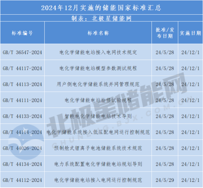 2024年12月起,將有9個(gè)國(guó)家級(jí)儲(chǔ)能標(biāo)準(zhǔn)開(kāi)始實(shí)施,其中包括:電化學(xué)儲(chǔ)能電站接入電網(wǎng)運(yùn)行控制規(guī)范、鋰離子電池儲(chǔ)能系統(tǒng)安全評(píng)估規(guī)范、用戶(hù)側(cè)鋰離子電池儲(chǔ)能設(shè)備驗(yàn)收規(guī)范、預(yù)制艙式儲(chǔ)能電站設(shè)計(jì)規(guī)范等,為規(guī)范電站運(yùn)營(yíng)、保障儲(chǔ)能安全提供重要支撐。 具體詳情如下: 《電化學(xué)儲(chǔ)能電站接入電網(wǎng)運(yùn)行控制規(guī)范》GB/T 44112-2024 由國(guó)網(wǎng)江蘇省電力有限公司、國(guó)網(wǎng)江蘇省電力有限公司電力科學(xué)研究院、國(guó)網(wǎng)浙江省電力有限公司、中國(guó)電力科學(xué)研究院有限公司、國(guó)網(wǎng)江西省電力有限公司電力科學(xué)研究院共同起草。 規(guī)定電化學(xué)儲(chǔ)能電站并網(wǎng)前應(yīng)按照GB/T36548要求開(kāi)展并網(wǎng)運(yùn)行調(diào)試并通過(guò)啟動(dòng)驗(yàn)收,在并網(wǎng)運(yùn)行6個(gè)月內(nèi)向電網(wǎng)調(diào)度機(jī)構(gòu)提交并網(wǎng)運(yùn)行調(diào)試報(bào)告。 儲(chǔ)能電池、變流器等主要一次設(shè)備檢修或更換,以及監(jiān)控系統(tǒng)、保護(hù)等主要二次設(shè)備改造或升級(jí),影響電化學(xué)儲(chǔ)能電站涉網(wǎng)性能時(shí),電化學(xué)儲(chǔ)能電站重新接人電網(wǎng)前應(yīng)通過(guò)調(diào)試試驗(yàn)并完成驗(yàn)收。 《電力系統(tǒng)配置電化學(xué)儲(chǔ)能電站規(guī)劃導(dǎo)則》GB/T 44134-2024 由國(guó)網(wǎng)經(jīng)濟(jì)技術(shù)研究院有限公司、國(guó)家電網(wǎng)有限公司、國(guó)網(wǎng)江蘇省電力有限公司、國(guó)網(wǎng)湖南省電力有限公司、國(guó)網(wǎng)河北省電力有限公司、國(guó)網(wǎng)山東省電力公司、清華四川能源互聯(lián)網(wǎng)研究院、衢州鵬輝能源科技有限公司、中國(guó)電力科學(xué)研究院有限公司、國(guó)網(wǎng)能源研究院有限公司10家單位共同起草。 本文件規(guī)定了電力系統(tǒng)配置電化學(xué)儲(chǔ)能電站的系統(tǒng)需求分析,以及電化學(xué)儲(chǔ)能電站在電源側(cè)、電網(wǎng)側(cè)、用戶(hù)側(cè)的配置原則和方法。 適用于接入10(6)kV及以上電壓等級(jí)電力系統(tǒng)的電化學(xué)儲(chǔ)能電站的規(guī)劃配置。 《預(yù)制艙式鋰離子電池儲(chǔ)能系統(tǒng)技術(shù)規(guī)范》GB/T 44026-2024 由中國(guó)電力科學(xué)研究院有限公司、寧德時(shí)代新能源科技股份有限公司、陽(yáng)光電源股份有限公司、比亞迪汽車(chē)工業(yè)有限公司、浙江華云清潔能源有限公司、杭州高特電子設(shè)備股份有限公司、北京金風(fēng)零碳能源有限公司、中國(guó)能源建設(shè)集團(tuán)廣東省電力設(shè)計(jì)研究院有限公司、北京海博思創(chuàng)科技股份有限公司、武漢億緯儲(chǔ)能有限公司、華為數(shù)字能源技術(shù)有限公司、上海電器設(shè)備檢測(cè)所、廣州智光儲(chǔ)能科技有限公司、中集儲(chǔ)能科技有限公司、國(guó)家能源集團(tuán)新能源技術(shù)研究院有限公司、中國(guó)華電科工集團(tuán)有限公司、天津力神新能源科技有限公司17家單位共同起草。 規(guī)定了預(yù)制艙式鋰離子電池儲(chǔ)能系統(tǒng)(以下簡(jiǎn)稱(chēng)“預(yù)制艙式儲(chǔ)能系統(tǒng)”)的外觀、尺寸和防護(hù)等級(jí)、設(shè)備及部件、功能要求與性能要求,描述了相應(yīng)的試驗(yàn)方法,規(guī)定了分類(lèi)和編碼、正常工作條件、檢驗(yàn)規(guī)則、標(biāo)志、包裝、運(yùn)輸和貯存等內(nèi)容。 文件適用于額定功率不小于100kW且額定能量不小于200kW·h的預(yù)制艙式儲(chǔ)能系統(tǒng)的設(shè)計(jì)、制造、試驗(yàn)、檢驗(yàn)、運(yùn)行、維護(hù)和檢修。 《電化學(xué)儲(chǔ)能系統(tǒng)接入低壓配電網(wǎng)運(yùn)行控制規(guī)范》GB/T 44114-2024 由國(guó)網(wǎng)浙江省電力有限公司、中國(guó)電力科學(xué)研究院有限公司、嘉興恒創(chuàng)電力設(shè)計(jì)研究院有限公司、浙江電騰云光伏科技有限公司、國(guó)網(wǎng)電力科學(xué)研究院有限公司、國(guó)家電力調(diào)度控制中心、國(guó)網(wǎng)江蘇省電力有限公司、國(guó)網(wǎng)上海能源互聯(lián)網(wǎng)研究院有限公司、東南大學(xué)、河海大學(xué)共同起草。 規(guī)定了電化學(xué)儲(chǔ)能系統(tǒng)接入低壓配電網(wǎng)的總體要求、運(yùn)行管理、并/離網(wǎng)切換、功率控制、運(yùn)行適應(yīng)性、保護(hù)、通信、電能質(zhì)量和電能計(jì)量的技術(shù)要求。 文件適用于接人10(6)kV以下配電網(wǎng)的電化學(xué)儲(chǔ)能系統(tǒng)的運(yùn)行控制 《智能電化學(xué)儲(chǔ)能電站技術(shù)導(dǎo)則》GB/T 44133-2024 由廣州易能數(shù)字科技有限公司、廣東電網(wǎng)有限責(zé)任公司廣州供電局、廣東省電力開(kāi)發(fā)有限公司、南方電網(wǎng)數(shù)字企業(yè)科技(廣東)有限公司、華為數(shù)字能源技術(shù)有限公司、上能電氣股份有限公司、湖北汽車(chē)工業(yè)學(xué)院共同起草。 文件規(guī)定了智能電化學(xué)儲(chǔ)能電站的系統(tǒng)架構(gòu)、智能運(yùn)行維護(hù)、智能檢修、安全管理、智能運(yùn)營(yíng)的技術(shù)要