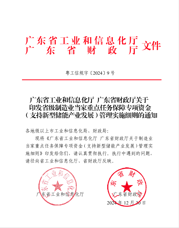 2024年12月30日,為加強和規(guī)范對制造業(yè)當(dāng)家重點任務(wù)保障專項資金的管理,提高資金使用效益,廣東省工業(yè)和信息化廳、廣東省財政廳發(fā)布《廣東省工業(yè)和信息化廳廣東省財政廳關(guān)于制造業(yè)當(dāng)家重點任務(wù)保障專項資金(支持新型儲能產(chǎn)業(yè)發(fā)展)管理實施細則》。 其中明確支持范圍:(一)新型儲能產(chǎn)業(yè)領(lǐng)域具備較大競爭優(yōu)勢的鋰電池、鈉離子電池、液流電池、氫儲能/燃料電池、飛輪電池等產(chǎn)品的工程研發(fā)及產(chǎn)業(yè)化項目。(二)儲能電池用材料、電子元器件、生產(chǎn)工藝裝備等產(chǎn)品的工程研發(fā)及產(chǎn)業(yè)化項目。(三)儲能電池管理系統(tǒng)(BMS)、能量管理系統(tǒng)(EMS)、變流器(PCS)及系統(tǒng)集成等產(chǎn)品的工程研發(fā)及產(chǎn)業(yè)化項目。(四)省委、省政府確定扶持的其他事項。 原則上采用事后獎勵形式,對符合 申報條件的項目在規(guī)定時間內(nèi)投入的產(chǎn)業(yè)化費用(僅限于設(shè)備 購置費、配套軟件購置費、設(shè)備軟件安裝調(diào)試費、研發(fā)材料購 置費、自研設(shè)備外協(xié)加工費、工程樣品測試費,不含稅),按照不超過30%的比例予以支持,獎補資金最高不超過1000萬元。 以下為政策原文: