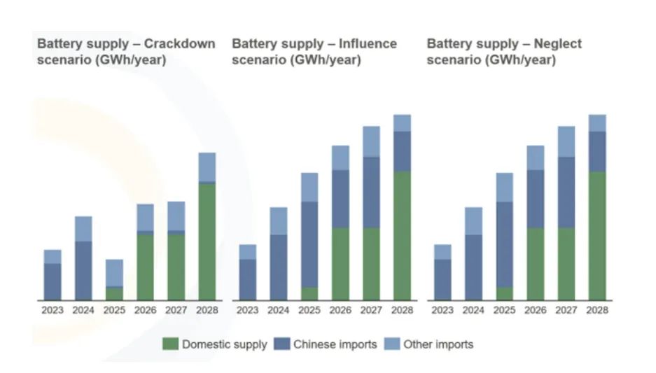 如何填補(bǔ)剩余的供應(yīng)缺口將取決于眾多難以預(yù)測(cè)的因素,特別是圍繞UFLPA法案對(duì)進(jìn)口電池的限制和承諾提高關(guān)稅。為此,清潔能源協(xié)會(huì)(CEA)為UFLPA戰(zhàn)略設(shè)定了三種可能的情景: