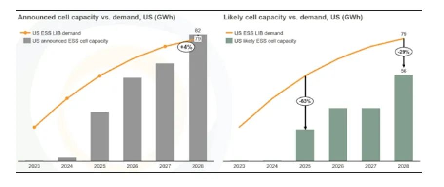 對(duì)于美國儲(chǔ)能行業(yè)而言,其可能被認(rèn)為依賴于廉價(jià)進(jìn)口的磷酸鐵鋰(LFP)電池。然而,首個(gè)針對(duì)電池儲(chǔ)能產(chǎn)品的關(guān)稅是拜登政府于2024年5月宣布的,即從2026年開始對(duì)中國制造的電池征收25%關(guān)稅。此舉與先進(jìn)的制造業(yè)稅收抵免以及對(duì)美國國內(nèi)制造產(chǎn)品投資的稅收抵免措施相結(jié)合,旨在加速美國電池制造業(yè)發(fā)展。這一舉措已經(jīng)初見成效,據(jù)清潔能源協(xié)會(huì)(CEA)統(tǒng)計(jì),目前美國宣布的用于儲(chǔ)能系統(tǒng)的電池產(chǎn)能已超過80GWh,預(yù)計(jì)將在2028年前實(shí)現(xiàn)這一目標(biāo)。