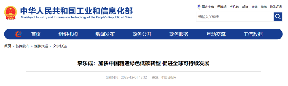 2025年12月1日,《中國日報》刊發(fā)工業(yè)和信息化部黨組書記、部長李樂成署名文章,題為《加快中國制造綠色低碳轉(zhuǎn)型促進(jìn)全球可持續(xù)發(fā)展》。文章指出,加強(qiáng)綠色產(chǎn)業(yè)國際合作。中國制造將秉持共商共建原則,利用好雙邊和多邊國際合作機(jī)制,深化綠色技術(shù)、綠色裝備、綠色貿(mào)易、綠色標(biāo)準(zhǔn)等方面交流合作。鼓勵中國光伏、風(fēng)電、鋰電池、新能源汽車等優(yōu)勢企業(yè)“走出去”,在“一帶一路”等國家投資建設(shè)綠色能源項目,推廣綠色基礎(chǔ)設(shè)施和交通解決方案。積極參與綠色低碳國際規(guī)則制定,加強(qiáng)國際公約履約能力建設(shè)。 全文如下: 在全球氣候治理深化和能源革命加速的背景下,制造業(yè)綠色低碳轉(zhuǎn)型已成為國際社會的普遍共識。習(xí)近平主席提出“綠水青山就是金山銀山”的理念,指引中國經(jīng)濟(jì)發(fā)展范式發(fā)生了根本轉(zhuǎn)變。中國作為負(fù)責(zé)任的制造業(yè)大國,以實現(xiàn)新型工業(yè)化為關(guān)鍵任務(wù),把綠色低碳作為新型工業(yè)化的生態(tài)底色,協(xié)同推進(jìn)降碳、減污、擴(kuò)綠、增長,為全球可持續(xù)發(fā)展貢獻(xiàn)了中國智慧和解決方案。 強(qiáng)化綠色理念引領(lǐng)。理念是行動的先導(dǎo),中國制造綠色轉(zhuǎn)型的深層動力正是源于習(xí)近平生態(tài)文明思想,“綠水青山就是金山銀山”理念的提出,是對傳統(tǒng)工業(yè)發(fā)展范式的超越,引領(lǐng)中國走上了高質(zhì)量發(fā)展與高水平保護(hù)并舉之路。在科學(xué)理念指引下,中國構(gòu)建了碳達(dá)峰碳中和“1+N”政策體系,將碳達(dá)峰碳中和這一宏偉目標(biāo)轉(zhuǎn)化為可落地、可衡量的具體行動,通過綠色標(biāo)準(zhǔn)、綠色金融、碳交易市場等政策工具,為綠色低碳轉(zhuǎn)型創(chuàng)造穩(wěn)定且可預(yù)期的市場環(huán)境。近年來,中國的經(jīng)濟(jì)發(fā)展對能源的依賴度逐步降低。2021—2024年,中國以年均3%左右的能源消費(fèi)增速支撐了年均5%以上的工業(yè)經(jīng)濟(jì)增長。綠色轉(zhuǎn)型催生出強(qiáng)大的新經(jīng)濟(jì)動能,中國建成了全球最大新能源產(chǎn)業(yè)鏈,2024年,中國風(fēng)光發(fā)電總裝機(jī)超過12億千瓦,提前6年完成國家自主貢獻(xiàn)提出的2030年裝機(jī)目標(biāo),全球超過一半的電動汽車在中國道路上行駛。 深化綠色技術(shù)創(chuàng)新。科技創(chuàng)新是制造業(yè)綠色轉(zhuǎn)型的核心驅(qū)動力。中國將綠色技術(shù)創(chuàng)新納入國家創(chuàng)新體系,在政府戰(zhàn)略支持、規(guī)模經(jīng)濟(jì)驅(qū)動、產(chǎn)業(yè)生態(tài)協(xié)同的共同作用下,綠色技術(shù)創(chuàng)新成果顯著。國家知識產(chǎn)權(quán)局發(fā)布的《2024年中國專利調(diào)查報告》顯示,中國近五成企業(yè)已開展或計劃開展綠色技術(shù)創(chuàng)新。過去10年間,中國推動全球風(fēng)電和光伏技術(shù)平均度電成本分別累計下降超過60%和80%。傳統(tǒng)行業(yè)綠色技術(shù)創(chuàng)新也取得了突破,百萬噸級氫冶金產(chǎn)線、30萬噸級綠色合成氨已經(jīng)實現(xiàn)全流程工藝貫通,百萬噸級碳捕集利用與封存(CCUS)項目全面建成投產(chǎn)。這些技術(shù)的突破和應(yīng)用,為更大規(guī)模、更深層次的制造業(yè)綠色低碳轉(zhuǎn)型奠定了基礎(chǔ)。 普及綠色制造模式。綠色制造是一種現(xiàn)代化的制造模式,具有低消耗、低排放、高效率、高效益的特點(diǎn)。中國構(gòu)建了以綠色工廠、綠色工業(yè)園區(qū)、綠色供應(yīng)鏈和綠色產(chǎn)品為關(guān)鍵載體的綠色制造體系,將綠色發(fā)展理念融入工業(yè)生產(chǎn)全過程。截至目前,中國培育了6430家綠色工廠、491家綠色工業(yè)園區(qū)、727家綠色供應(yīng)鏈企業(yè),推廣超4萬種綠色產(chǎn)品。其中,綠色工廠產(chǎn)值占制造業(yè)總產(chǎn)值比重從2020年的9%提高到20%,綠色工業(yè)園區(qū)單位工業(yè)增加值能耗、水耗僅為中國平均水平的2/3和1/4,固廢平均處置利用率超過95%。越來越多的中國企業(yè)將綠色設(shè)計、綠色采購等融入供應(yīng)鏈管理,帶動上下游企業(yè)共同實施綠色低碳改造,部分龍頭企業(yè)探索供應(yīng)鏈碳足跡管理,對產(chǎn)品全生命周期進(jìn)行碳管理。 貢獻(xiàn)綠色轉(zhuǎn)型方案。中國制造通過提供高質(zhì)量的綠色技術(shù)和產(chǎn)品,為全球綠色轉(zhuǎn)型提供了切實可行的路徑。中國的可再生能源產(chǎn)品出口到全球200多個國家和地區(qū),滿足全球80%以上的光伏組件和70%的風(fēng)電裝備需求,幫助世界各國特別是發(fā)展中國家獲得清潔、可靠、用得起的能源。以光伏為例,2021—2024年,中國累計生產(chǎn)約15.6萬億千瓦光伏組件,為全球提供了約3.2萬億千瓦時綠色電力,幫助各國減排二氧化碳約25.4億噸。中國同100多個國家和地區(qū)開展了綠色能源合作項目,為當(dāng)?shù)靥峁┝烁哔|(zhì)量的綠色能源裝備、可負(fù)擔(dān)的綠色電力。這些項目充分展示了中國方案在幫助發(fā)展中國家應(yīng)對氣候變化和發(fā)展經(jīng)濟(jì)方面的實際效果。 當(dāng)前,全球氣候治理歷經(jīng)曲折,個別國家逆流而動,對國際規(guī)則和國際秩序造成嚴(yán)